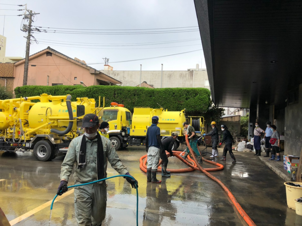 熊本地震では、重機の免許を新たに取得して、解体のお手伝いをさせてもらいましたし、昨年の人吉の豪雨災害では自社の強力吸引車と高圧洗浄車を用いて、家や建物に入った泥水を清掃しました。